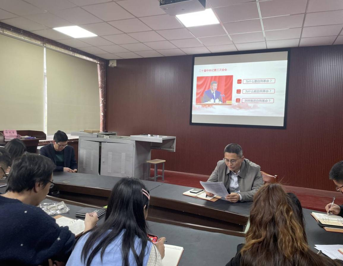 纪录片结束后,教职工党员在支部书记焦铬的带领下,从“我们党为什么要自我革命、我们党为什么能自我革命、我们党怎样推进自我革命”三个维度学习领会习近平总书记关于党的自我革命的重要思想。