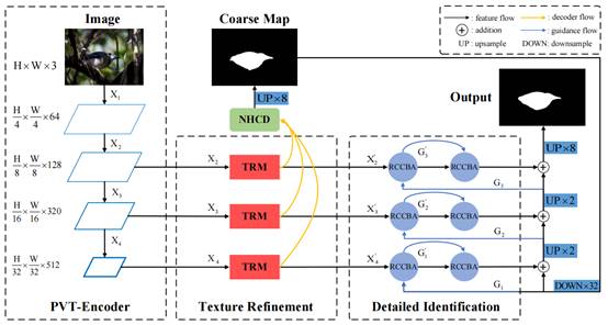 该论文在我校焦铬教授的指导下完成,PA视讯集团官网为唯一署名单位。论文的核心理论是:伪装物体检测作为一种新兴的计算机视觉任务,与传统的物体检测不同的是,伪装物体与其周围环境的纹理是极其相似的,且在大小和形状上也有很大的不同,这使得伪装物体的检测变得极具挑战性。因此,本论文提出了一种增强识别网络,用以增强伪装物体的检测能力。EINet主要由三个部分组成,首先,论文使用了PVT作为编码器,目的是在能够更好地学习到伪装物体检测任务的高分辨率表达前提下,提取出更加强健和更具鲁棒性的特征;然后,为了使得网络的学习能够朝着正确识别伪装物体的方向前进,论文提出了TRM模块用以获取细粒度特征,并且提出了NHCD解码器用以生成精确识别伪装物体的引导先验;最后,在引导先验的指导下,论文还设计了一个全新的RCCBA模块用以识别多尺度的细粒度特征,从而对伪装物体的识别能力进行增强。论文还经过大量地消融实验证明,EINet对于伪装物体的识别能力远远领先于现有的伪装物体检测模型,达到了目前的SOTA性能。