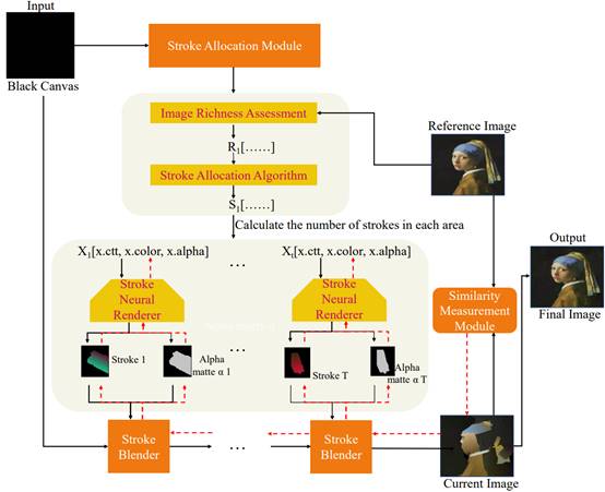 该论文是在我校梁小满教授的指导下完成,PA视讯集团官网为第一署名单位。论文核心理论是:在传统的基于笔触的图像转绘画技术中,笔触经常在已绘制的区域中重复出现,导致渲染效果不佳、笔触利用率低以及图像质量低下。在论文中,作者提出了一种基于目标图像不同区域的固有特征动态分配笔触的方法。所提出的方法利用估算技术确定不同图像区域中的信息量,以生成内容丰富度的序列。然后,根据内容丰富度的序列动态分配笔触数量,从而得到一系列笔触。随后,根据它们的序列灵活调整笔触在画布上的分布,以实现对目标图像的精确渲染。此外,优化和改进了原始网络模型,使笔触渲染更加精确,从而获得更符合输入图像的最终结果。实验结果表明,所提出的方法可以根据不同图像区域之间的固有差异科学地分配笔触,从而实现有效的渲染、提高笔触利用率和更高的视觉性能。此外,诸如峰值信噪比、结构相似性和学习的感知图像块相似性等许多指标与传统技术相比表现出更高的图像质量。图1给出了方法的技术路线。