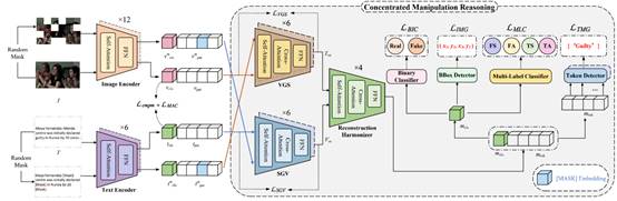 随着大规模生成模型的发展,生成逼真的图像和虚假新闻变得更加容易,但同时在多模态媒体篡改检测领域带来了新的挑战。本研究聚焦于Detecting and Grounding Multi-Modal Media Manipulation (DGM4)任务,即同时检测图像-文本对中的多模态篡改类型,并分别定位图像和文本中被篡改的区域和单词。与单一模态的假信息检测相比,DGM4任务因图像的复杂背景和自然语言的多样性而更难实现跨模态特征对齐。本文的核心理论基于这样的认识:多模态篡改往往在细微的语义不一致性中表现出来,通过不同模态之间的特征融合与推理,可以有效地检测篡改样本中的跨模态差异。因此,本文摒弃了传统的层次化推理范式,通过先进的掩码信号建模和设计基于Transformer的重构协调器,提出了一种名为Concentrated reasoning and Unified reconstruction的推理框架,促进重构特征之间更复杂的交互,从而整合特征,支撑细致的推理任务。