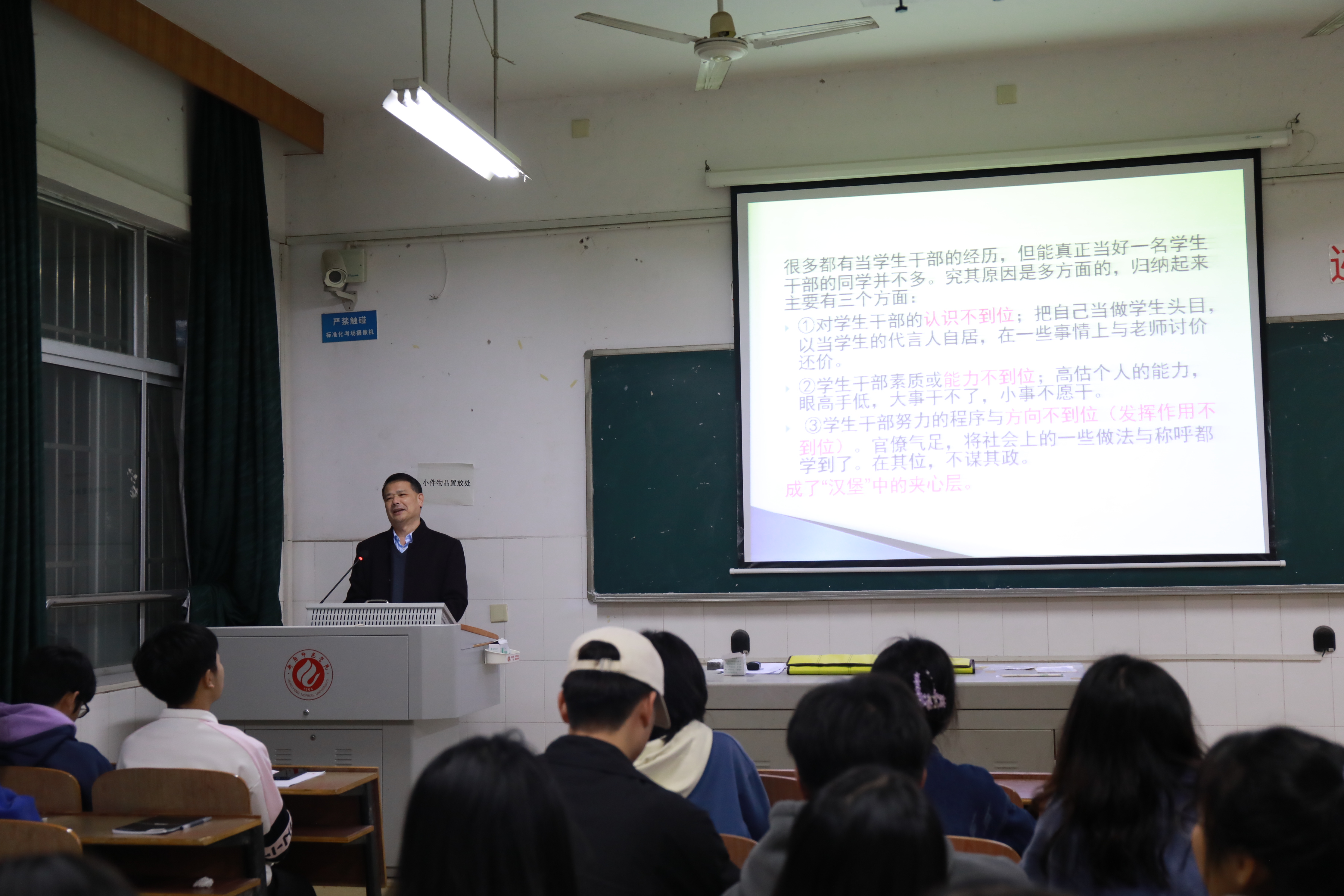 第二场讲座中,彭正副书记针对目前学生干部存在的问题,从三个方面总结原因:一是自我认知不到位,对自我身份的理解发生了偏差,二是能力不到位,没有正确处理好能力与工作的关系,三是方向不到位,错误的将社会上的不良的官僚作风自我代入,他指出,学生干部不仅要有优秀的学业成绩,还要加深对马克思主义的认识,强调学生干部一定要发挥引领作用,积极协调与同学与老师的关系,培养责任意识和集体意识。