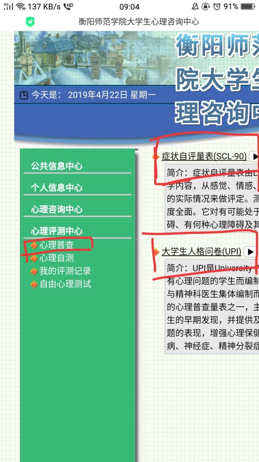 4、点击心理评测中心,再点开心理普测,填写旁边的两份问卷