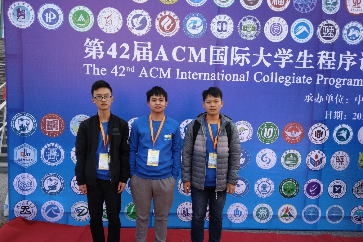 11月5日,全国高校第42届ACM国际大学生程序设计竞赛亚洲区域赛(青岛)在中国石油大学(华东)落下帷幕。本次大赛是由来自于全国包括朝鲜金日成综合大学、港大、清华、北大上交在内的226所大学363支队伍参加。刘新宇老师指导的2015级学生陈明慧、2016级学生陆俊杰和2016级学生张凯旋组成的“蔬菜(Vegetable)”队荣获铜奖。